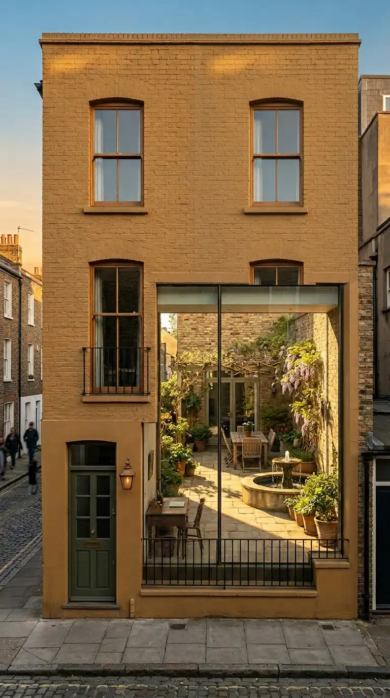 The street facade is solid and urban. The rear is more open. The courtyard is invisible from the street, a private oasis in the dense city. The emotional effect is urban, private, and surprisingly spacious given the narrow frontage.