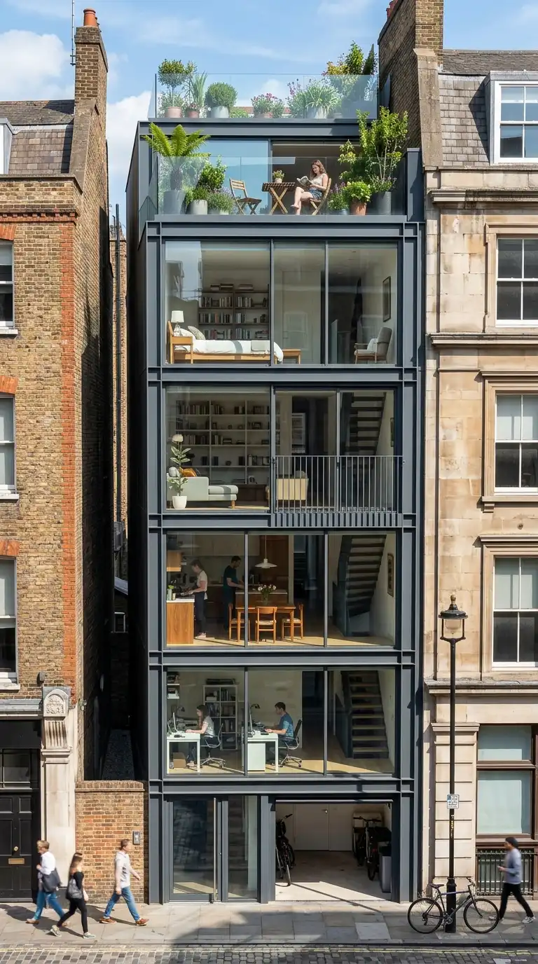 The tower house builds up instead of out. On a tiny urban site, the only direction is vertical. The house is 4-5 metres wide and 4-5 metres deep, but 3-5 storeys tall. Each floor has a single primary function. A stair connects all levels. The emotional effect is vertical, efficient, and surprisingly expansive given the tiny footprint.