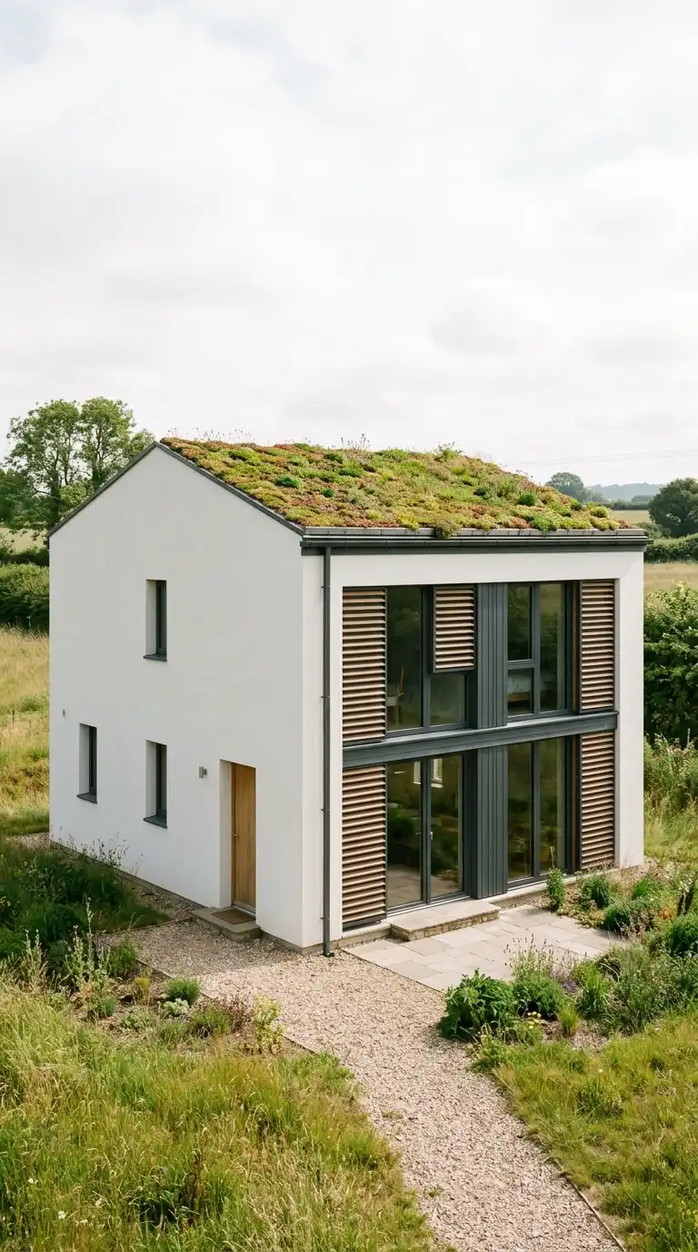 The Passive House is not a style but a performance standard. The design achieves exceptional energy efficiency through super-insulation, airtight construction, triple-glazed windows, and mechanical ventilation with heat recovery. The form is compact to minimise surface area. The emotional effect is comfortable, healthy, and responsible.