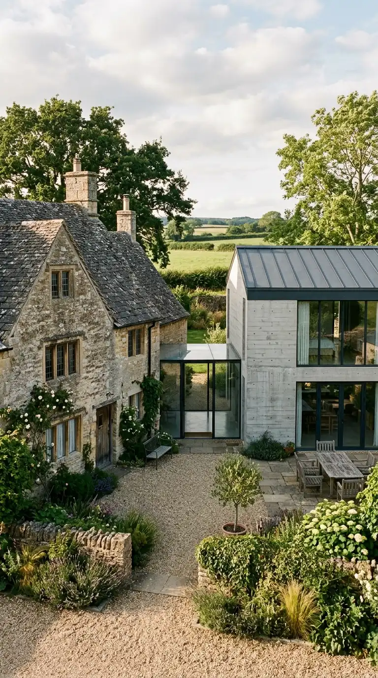 The renovated farmhouse respects the existing building while adding new wings, new windows, and new systems. The old part retains its character: timber beams, stone walls, small windows. The new part is clearly contemporary: glass, steel, concrete. The contrast between old and new is the entire point.