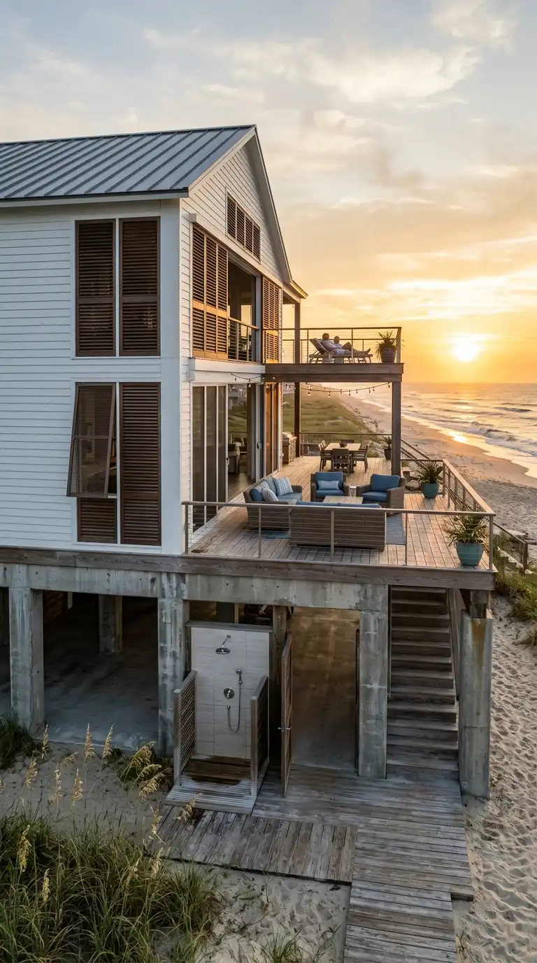 The beach house responds to a harsh coastal environment. Materials must resist salt, sand, and storms. The form is raised on pilings to allow storm surge to pass underneath. Decks and louvres provide shade and wind control. The emotional effect is relaxed, open, and connected to the sea.