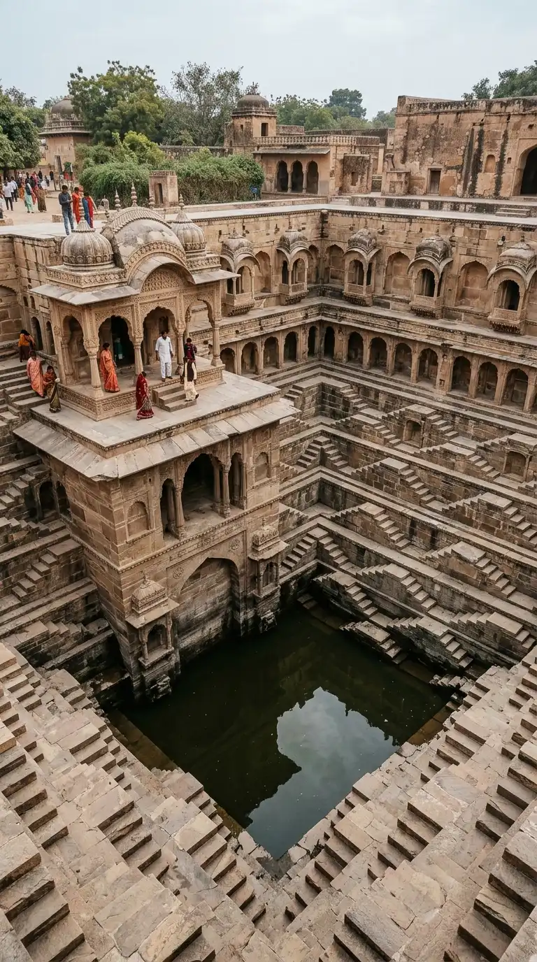 The stepwell is a well with steps descending to the water. The stepwell is a public water source and a place for gathering. The stepwell is often decorated with arched niches and small pavilions. The water is cool, and the steps create a shaded microclimate.