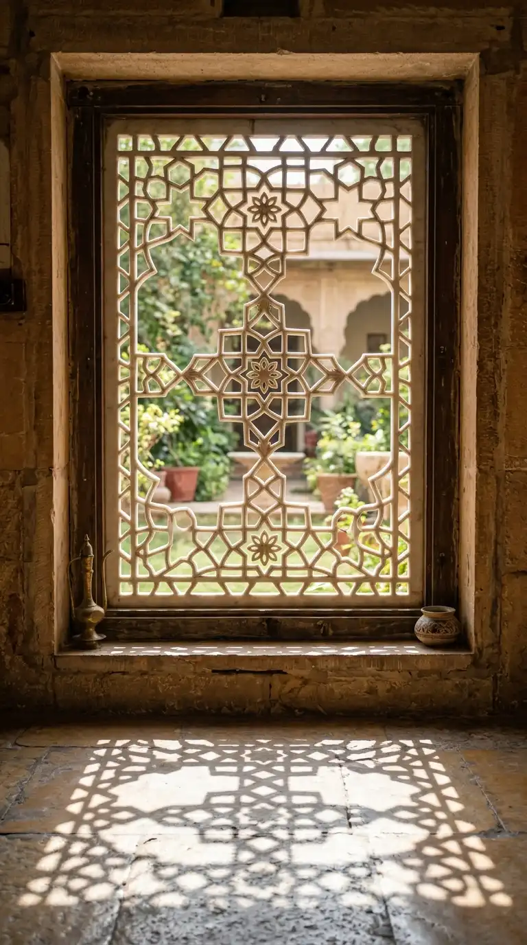 The jali is a perforated stone screen. The screen is carved with geometric or floral patterns. The jali admits light and air while providing privacy and shade. The screen is often used in windows, balconies, and railings.
