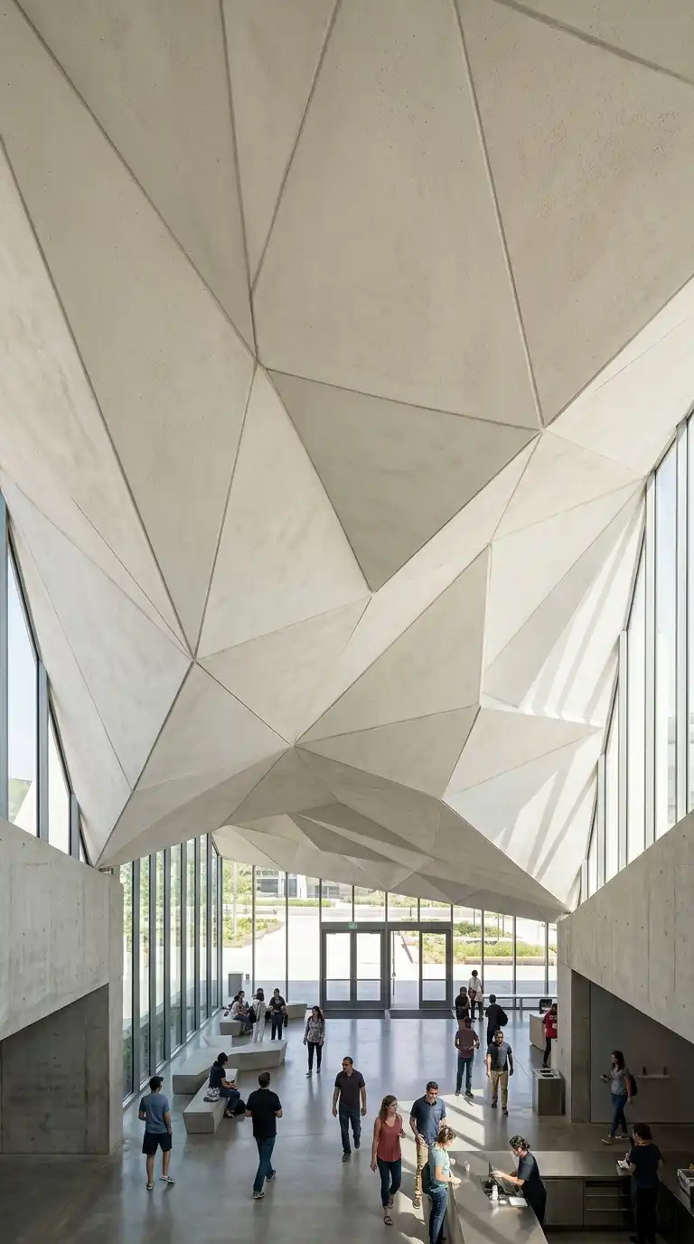 This design type is ideal for gymnasiums, auditoriums, and large-span roofs. The emotional effect is faceted, structural, and origami-like.