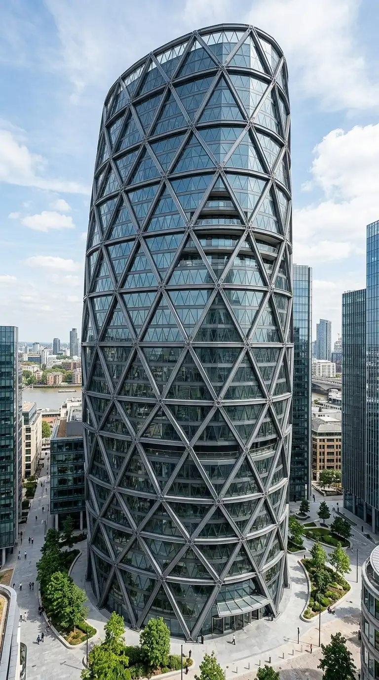 The diagrid structure is a diagonal grid of structural members. Unlike a vertical column grid, the diagrid carries both gravity and lateral loads. The diagonal members form a triangulated pattern. The structure is efficient and expressive.