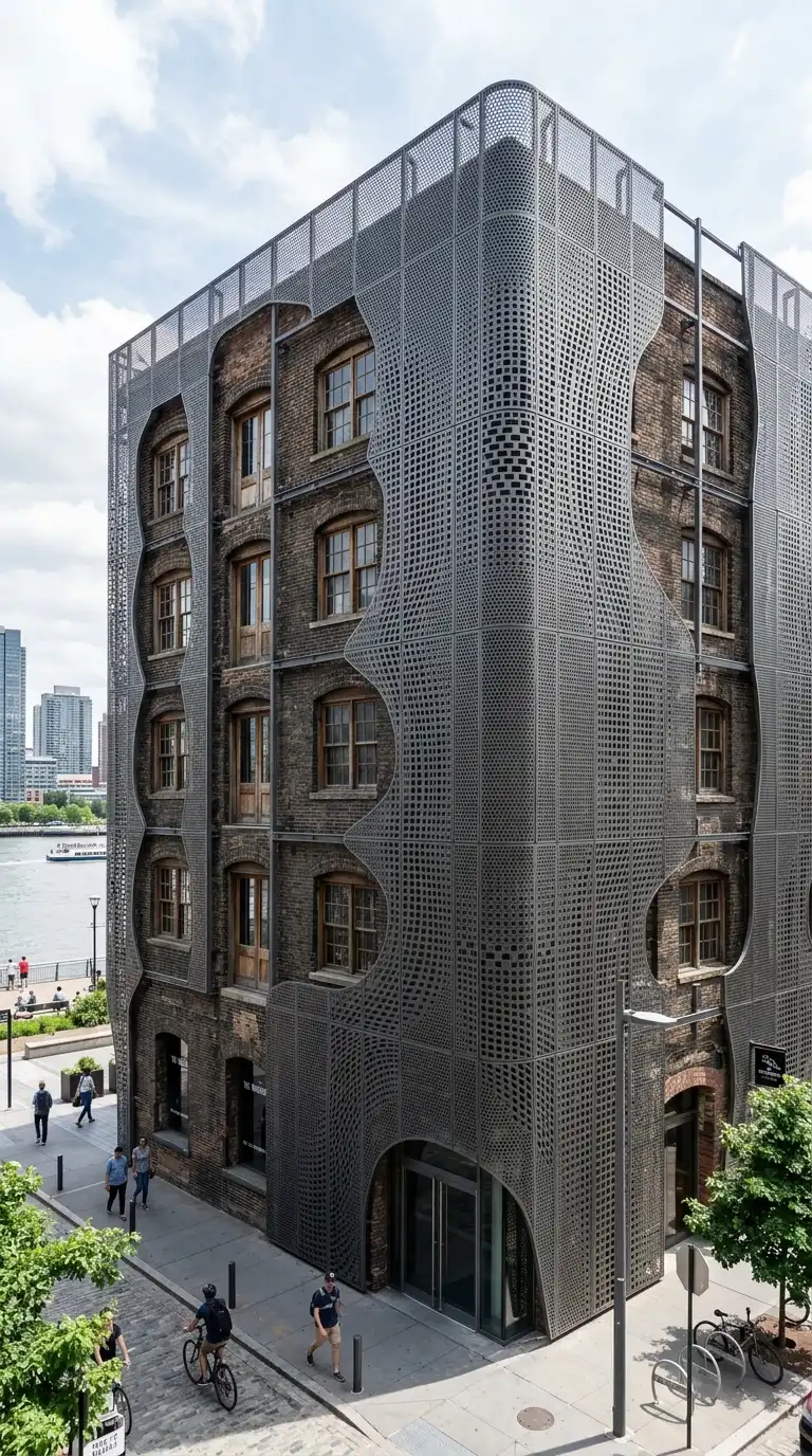 The adaptive reuse mesh wraps an existing building in a new parametric skin. The skin is generated by a mesh or a pattern that adapts to the existing building’s geometry. The skin is often perforated, allowing views and light.