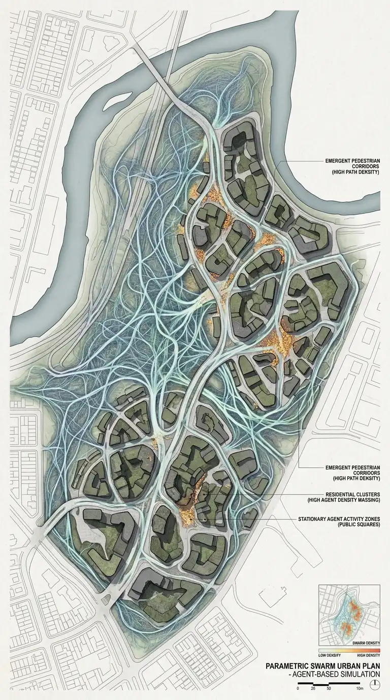 The swarm plan generates a building or urban plan from swarm behaviour. Agents (points) move according to simple rules: avoid each other, move toward goals, follow paths. The trajectories of the agents become the circulation paths. The densities become the building masses.