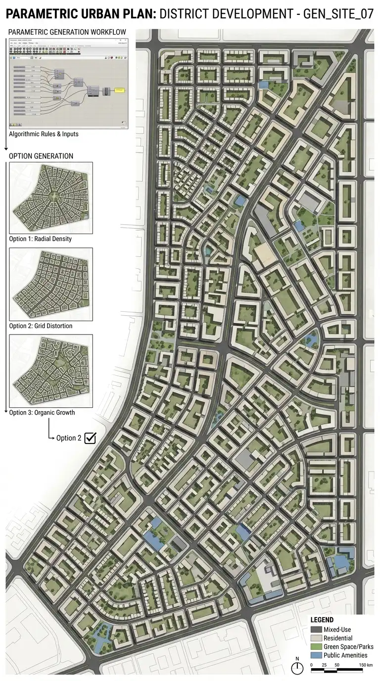 The parametric urban plan uses algorithms to generate city blocks, streets, and plots. The parameters include density, plot size, street width, solar access, and view. The algorithm generates thousands of options, and the architect selects the best.