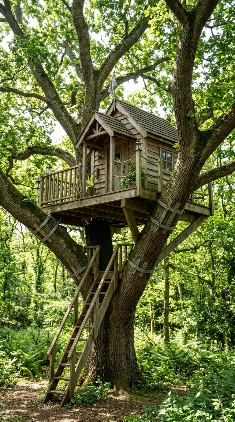 The treehouse is a small building supported by one or more living trees. The platform is attached to the tree with bolts or ropes that allow the tree to grow. The treehouse is not a house — it is a room in the air. The treehouse is playful, elevated, and magical.