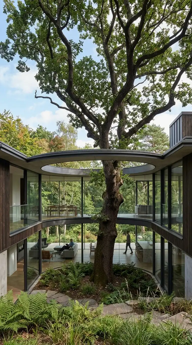 This design is ideal for houses, offices, and museums on wooded sites. The emotional effect is respectful, integrated, and nature-connected.