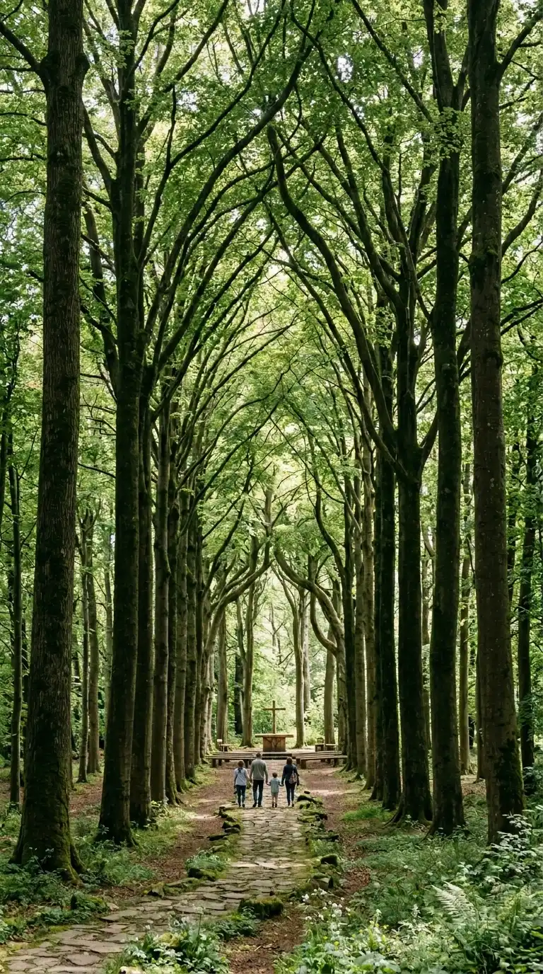 The tree cathedral is a grove of trees planted in the shape of a cathedral. The trees form the nave, the aisles, and the apse. The canopy is the vault. The tree cathedral is a living building. It is grown, not built.
