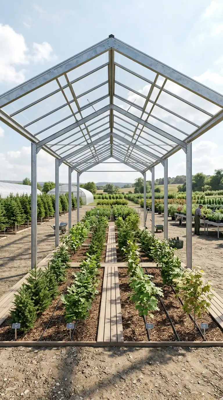 The tree nursery house is a greenhouse-like structure for growing trees. The house has a glass roof and open sides. The trees are planted in the ground. The house protects the trees while they grow. The tree nursery house is functional, protective, and temporary.