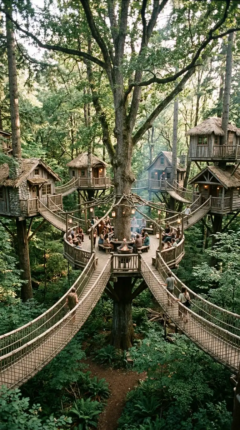 The tree house village is a cluster of treehouses connected by bridges and platforms. The village is a community in the trees. Each treehouse is a small room. The bridges are the streets. The tree house village is communal, elevated, and playful.