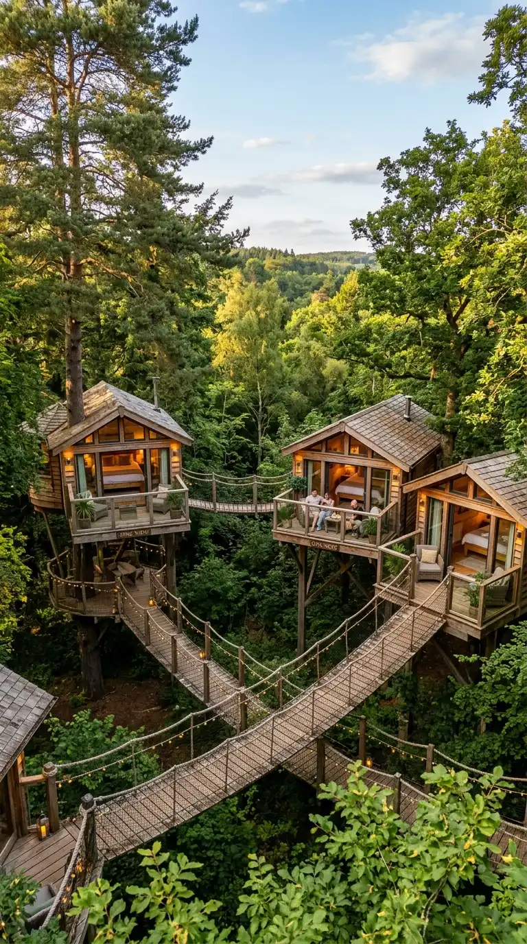 The tree house hotel is a cluster of treehouses for overnight guests. Each treehouse is a private room. The treehouses are connected by bridges or stairs. The tree house hotel is luxurious, elevated, and forested.