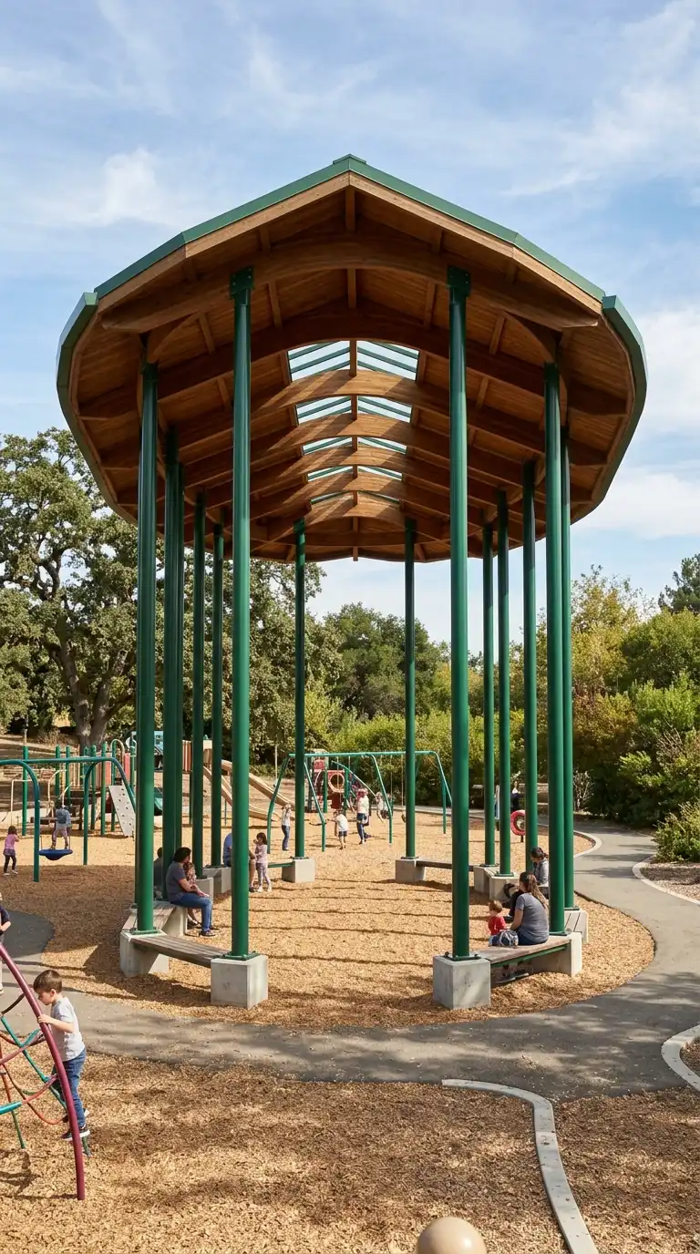 This design is ideal for bus stops, playgrounds, and outdoor classrooms. The emotional effect is open, shaded, and cool.