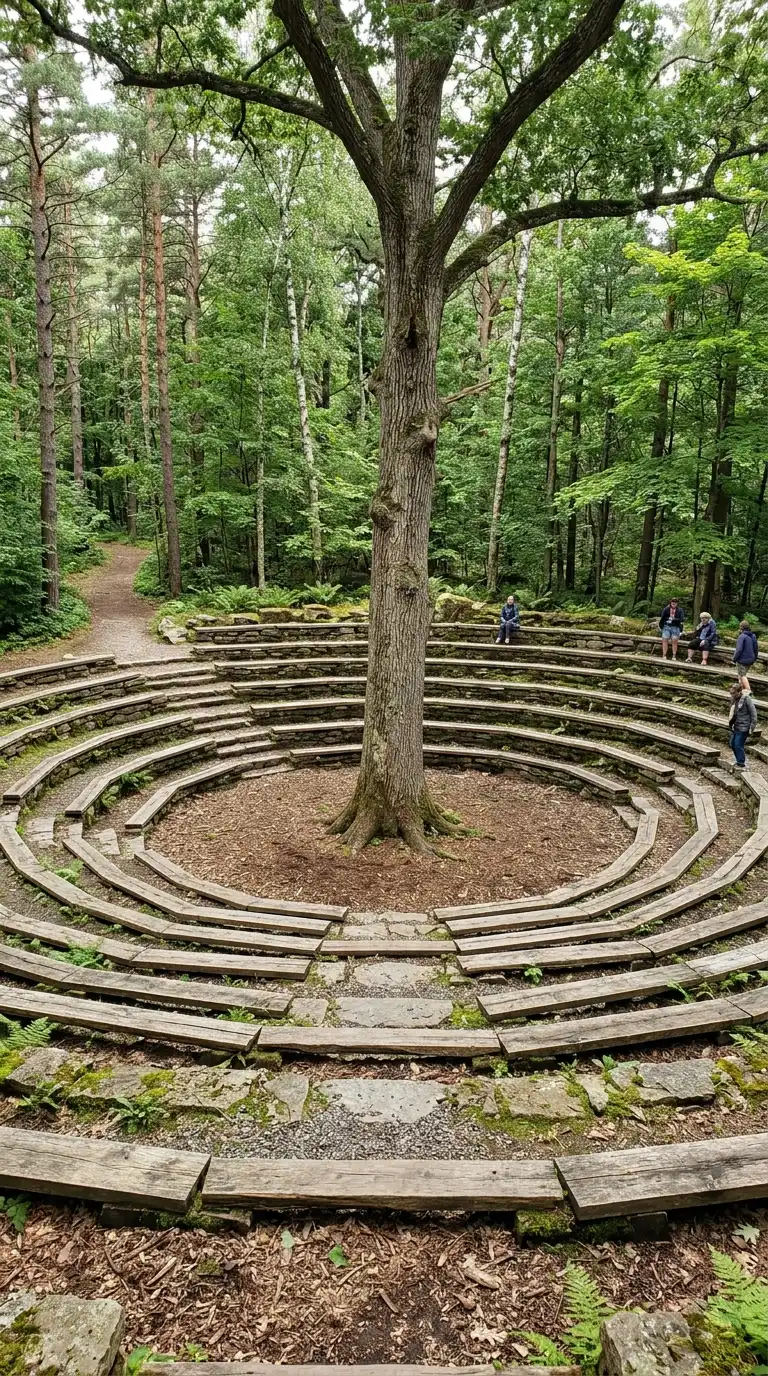 The tree ring amphitheatre is a circular seating area around a central tree. The seats are concentric rings, like the rings of a tree. The tree is the stage. The tree ring amphitheatre is circular, nested, and tree-centred.
