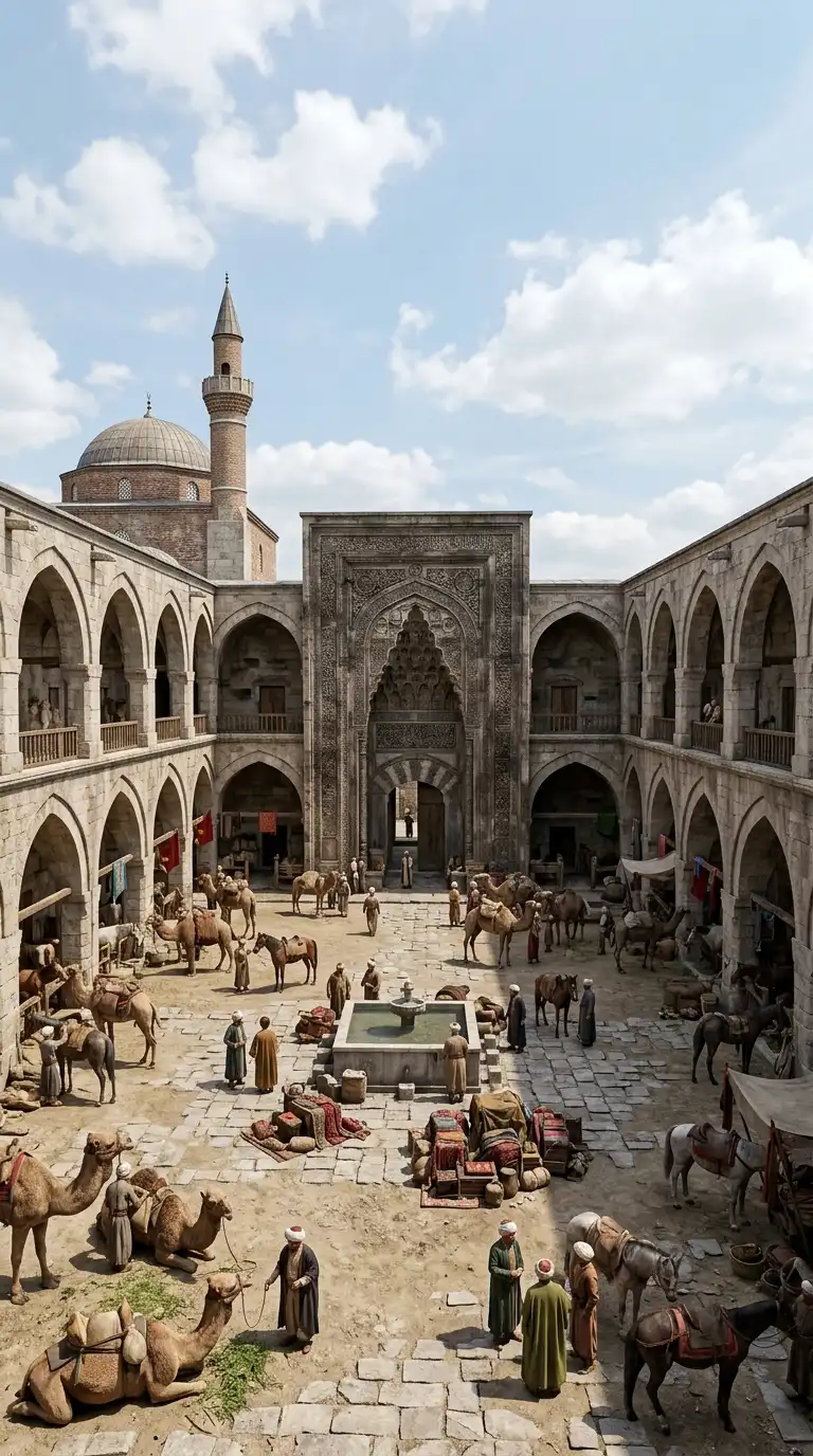 The Seljuk caravanserai was a roadside inn for merchants and their caravans. The plan is a large courtyard surrounded by arcaded rooms. The courtyard is large enough for camels or horses. The gateway is monumental, often with a carved portal. The caravanserai is protective, communal, and commercial.