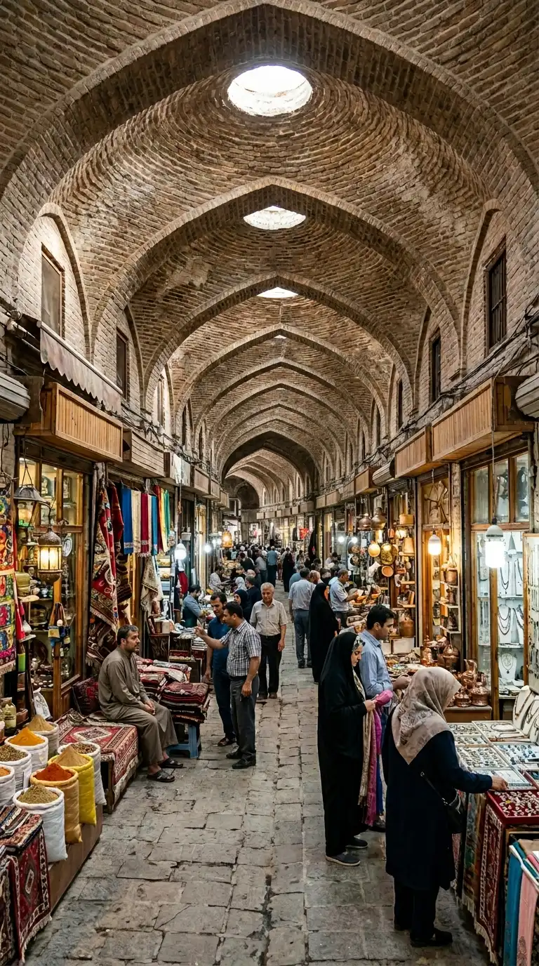 The covered bazaar is a market street covered by domes or vaults. The street is lined with shops on both sides. The domes have openings for light. The bazaar is a linear space, sometimes branching into smaller streets. The covered bazaar is bustling, shaded, and labyrinthine.