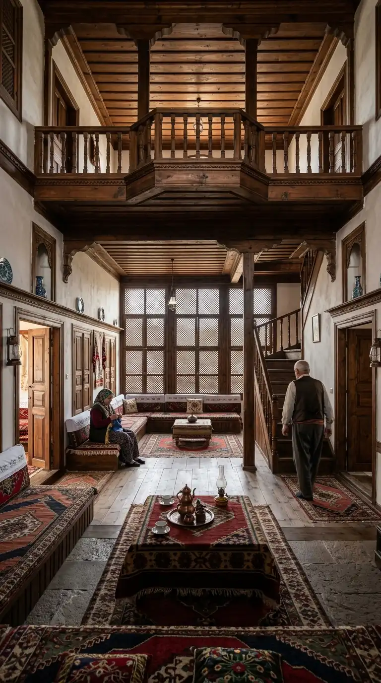 The Turkish house (konak) is a traditional Ottoman house. The house is organised around a central hall (sofa). The rooms open onto the sofa. The upper floor overhangs the lower floor. The windows have wooden lattices (kafes) for privacy. The Turkish house is inward-focused, private, and shaded.