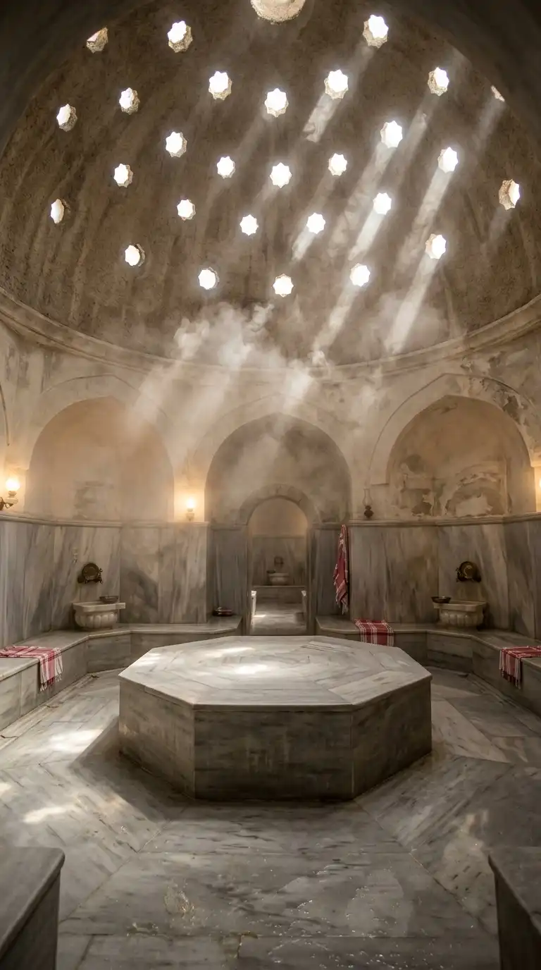 The Turkish bath (hammam) is a sequence of three rooms: cold, warm, and hot. The hot room has a domed ceiling with small glass openings. Light streams through the openings, creating a starry effect. Steam rises to the dome. The hammam is social, steamy, and relaxing.