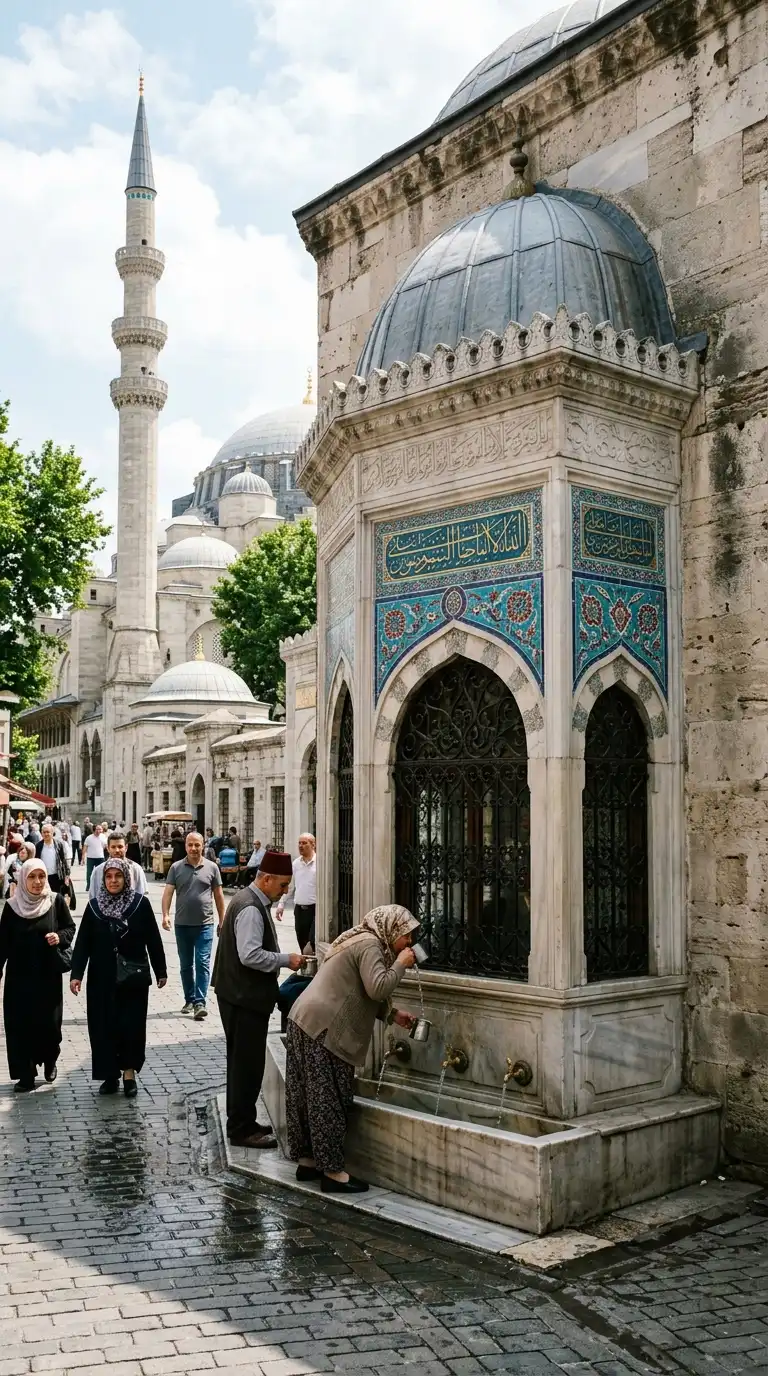 The Ottoman fountain (sebil) is a public fountain attached to a mosque or charitable complex. The sebil is a small kiosk with grilled windows. Water was distributed free to passersby. The sebil is decorated with marble, tile, and carved stone. The sebil is charitable, refreshing, and beautifully crafted.