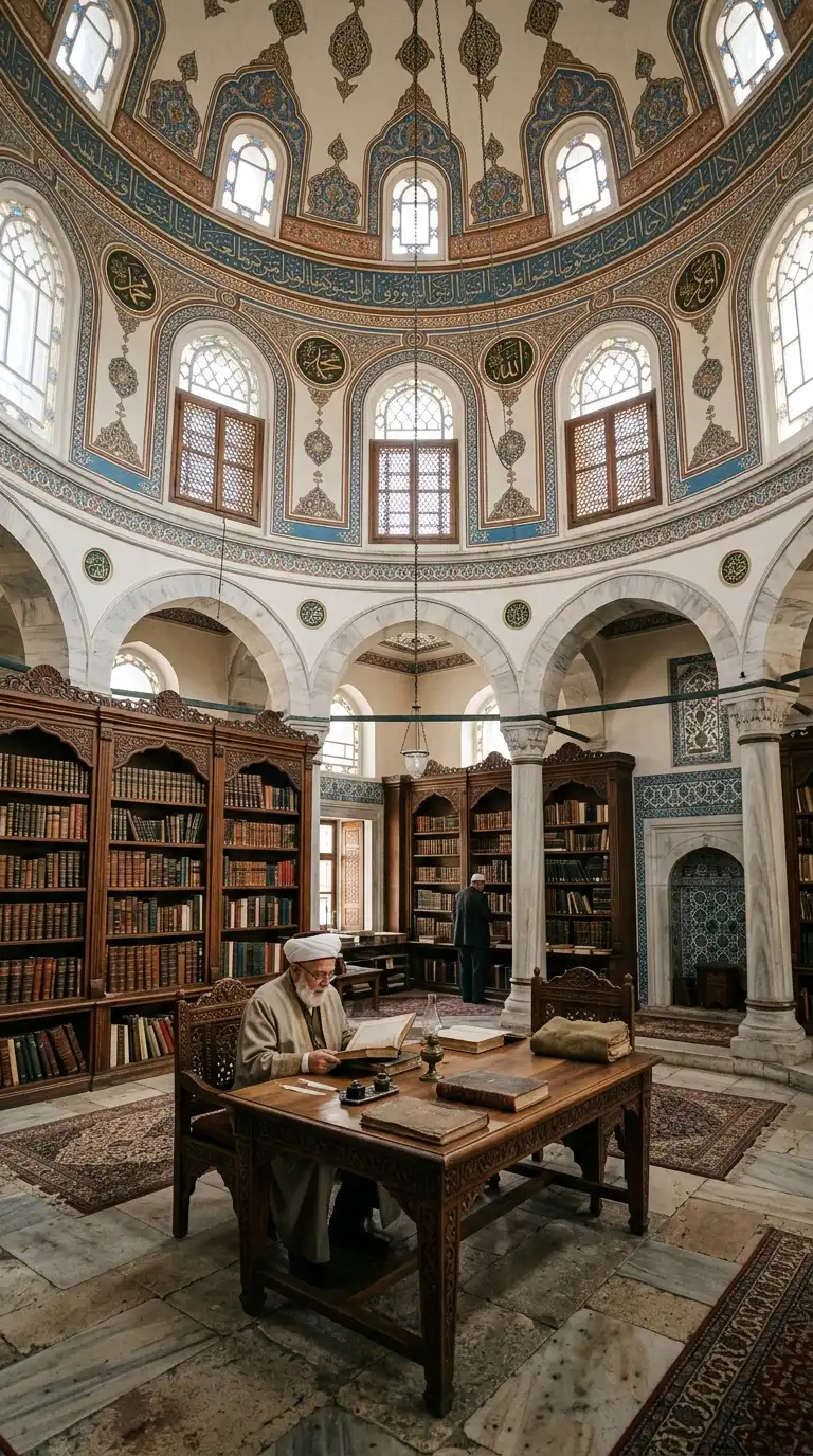 The Ottoman library is a domed reading room with bookcases on the walls. The dome has an oculus or skylights. The bookcases are built-in, often with carved wooden doors. The reading room is calm, light-filled, and scholarly.