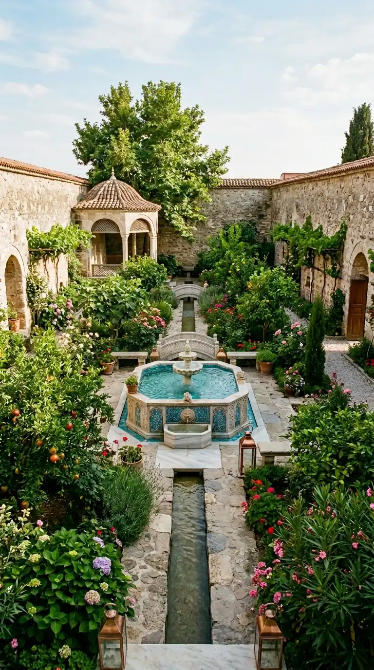 The Turkish garden is a walled garden with water channels, fruit trees, and flowering plants. The garden is divided into four quadrants by water channels. A central pool or pavilion marks the intersection. The Turkish garden is paradisiacal, ordered, and refreshing.