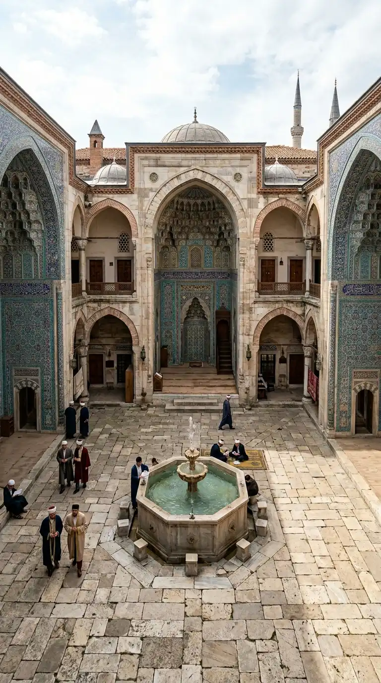 The Ottoman madrassa is a theological school. The plan is a courtyard with iwans on four sides. The iwans are vaulted halls open to the courtyard. Student cells are on the upper floor. The madrassa is scholarly, communal, and pious.