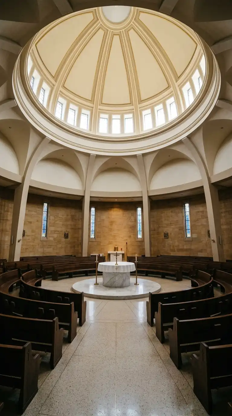 This design is ideal for baptisteries, chapels, and modern churches. The emotional effect is centralised, unified, and domed.
