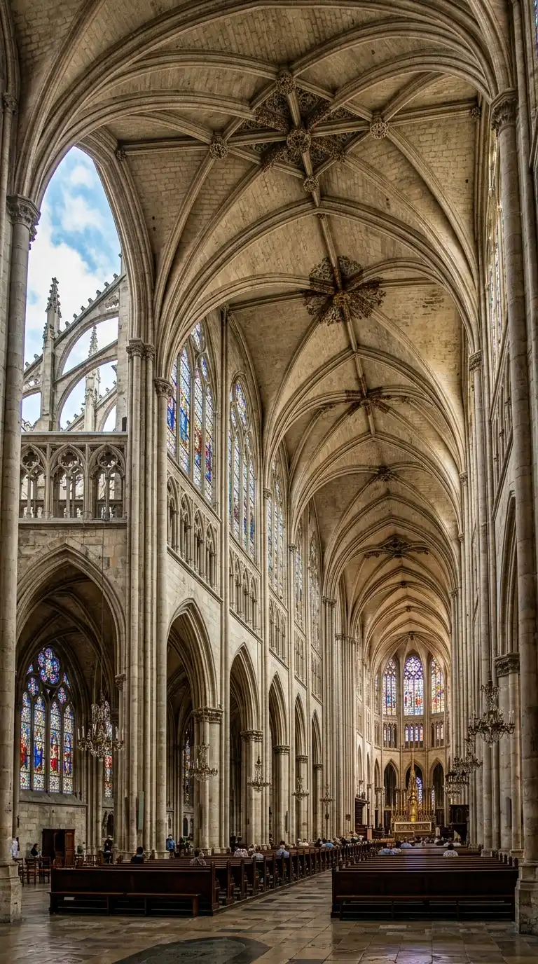 The Gothic cathedral is the most dramatic church form. The pointed arch, the ribbed vault, and the flying buttress allow unprecedented height and light. The walls are filled with stained glass. The cathedral reaches toward heaven. The Gothic cathedral is vertical, luminous, and awe-inspiring.