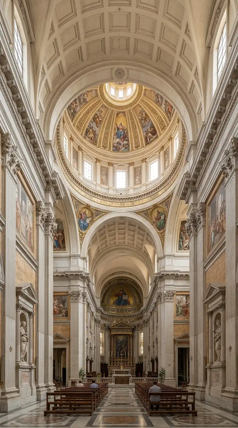 The Renaissance church returns to classical proportions. The plan is a Latin cross with a dome at the crossing. The facade is a temple front with columns and a pediment. The interior is light, calm, and mathematically ordered. The Renaissance church is rational, harmonious, and classical.