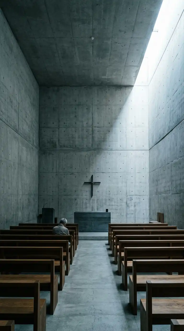 The modernist church strips away ornament to focus on space, light, and material. The form is simple — a cube, a circle, a tent. Light enters from above or through narrow slits. The material is exposed concrete, stone, or wood. The modernist church is honest, spiritual, and essential.