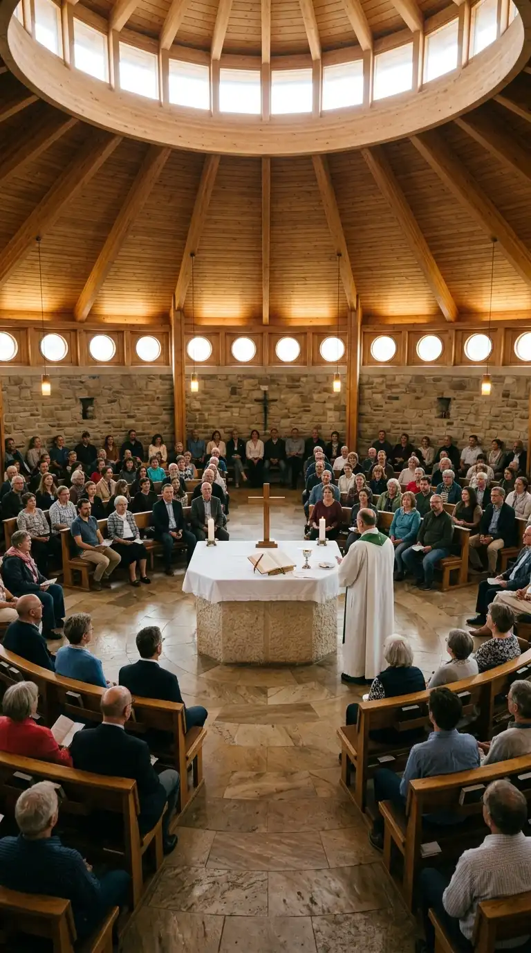 The chapel in the round has seating arranged around a central altar. The congregation surrounds the altar. The chapel in the round emphasises the priesthood of all believers and the community of worship. The chapel in the round is intimate, communal, and participatory.