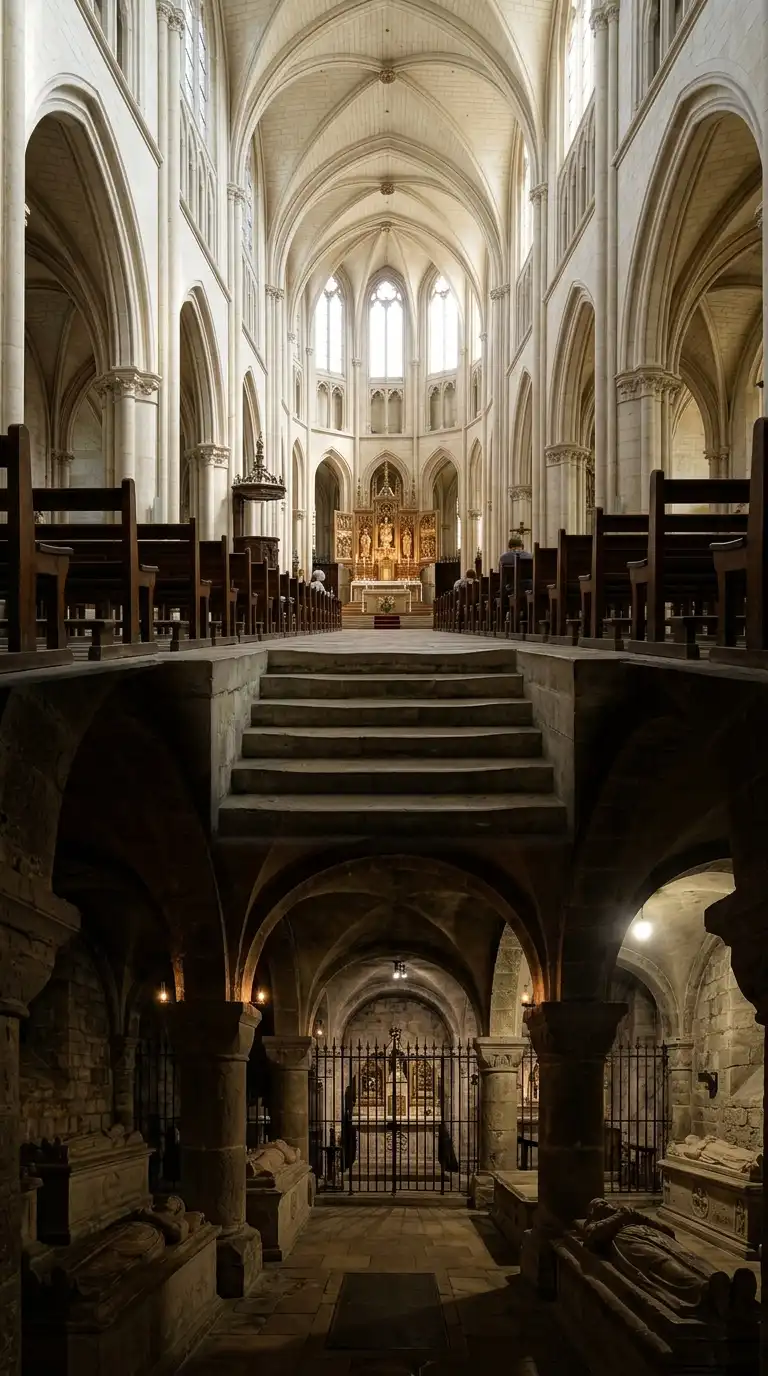 The crypt is a lower level, often below the altar. The crypt contains tombs or relics. The crypt is dark, low, and ancient. The church above is light, high, and alive. The contrast between crypt and church is the contrast between death and resurrection.