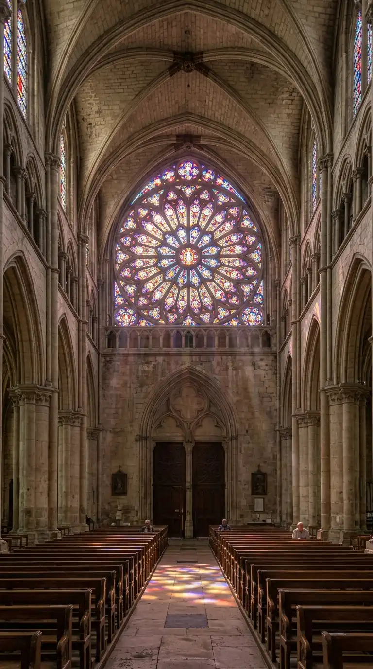 The rose window is a large circular window filled with stained glass. The rose window is on the west facade, above the entrance. The rose window is the most decorative element of the Gothic church. The rose window is radiant, colourful, and symbolic.