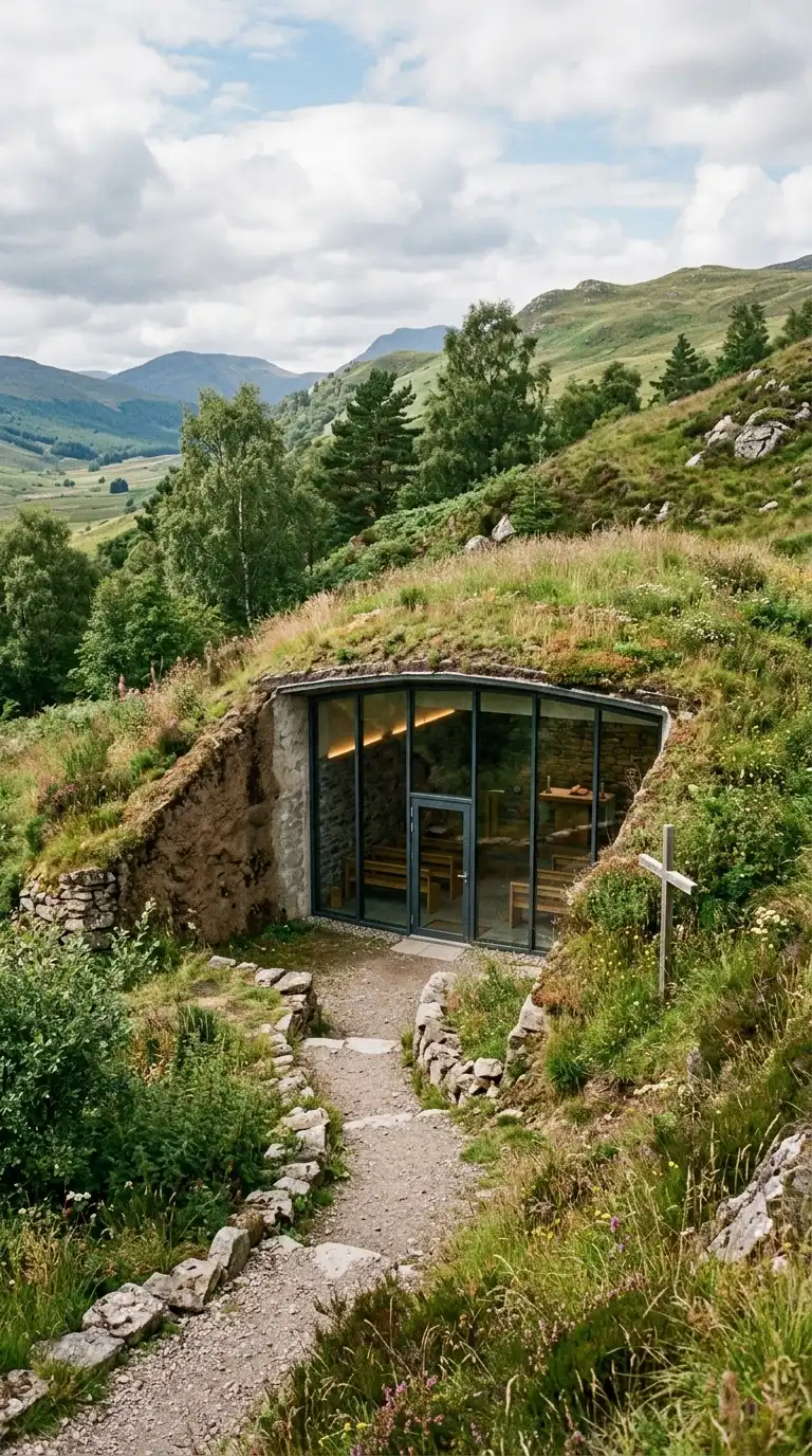 The church as landscape is integrated into the land. The roof is planted. The walls are earth. The church is buried or partially buried. The church emerges from the ground. The church is humble, earth-bound, and ecological.