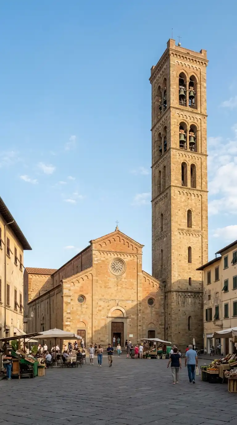 The campanile is a free-standing bell tower. The church and the tower are separate buildings. The campanile is tall, vertical, and visible from afar. The campanile calls the faithful to worship.