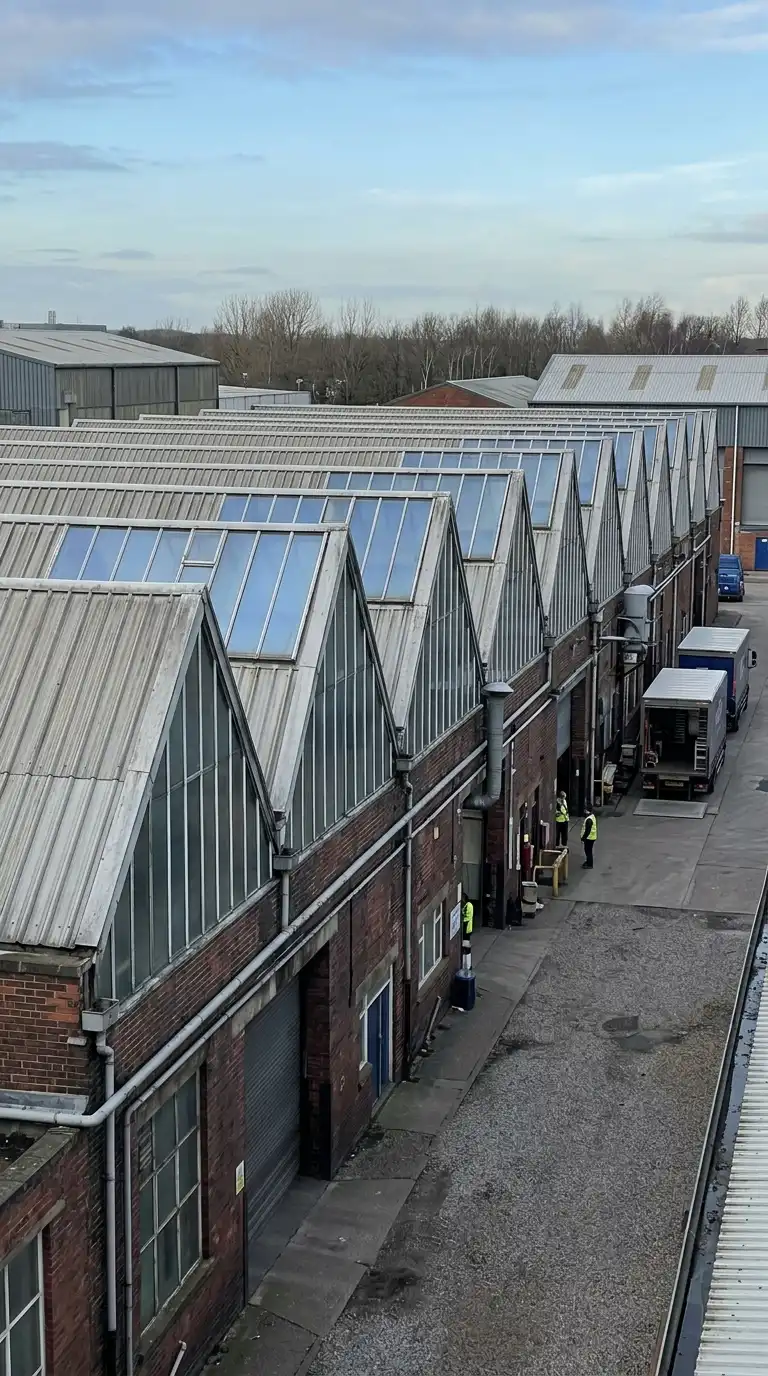 The sawtooth factory has a roof made of a series of shed roofs. Each shed roof has a vertical or near-vertical glazed face facing north. The sawtooth roof provides even, shadowless light for manufacturing. The sawtooth factory is industrial, rhythmic, and north-lit.