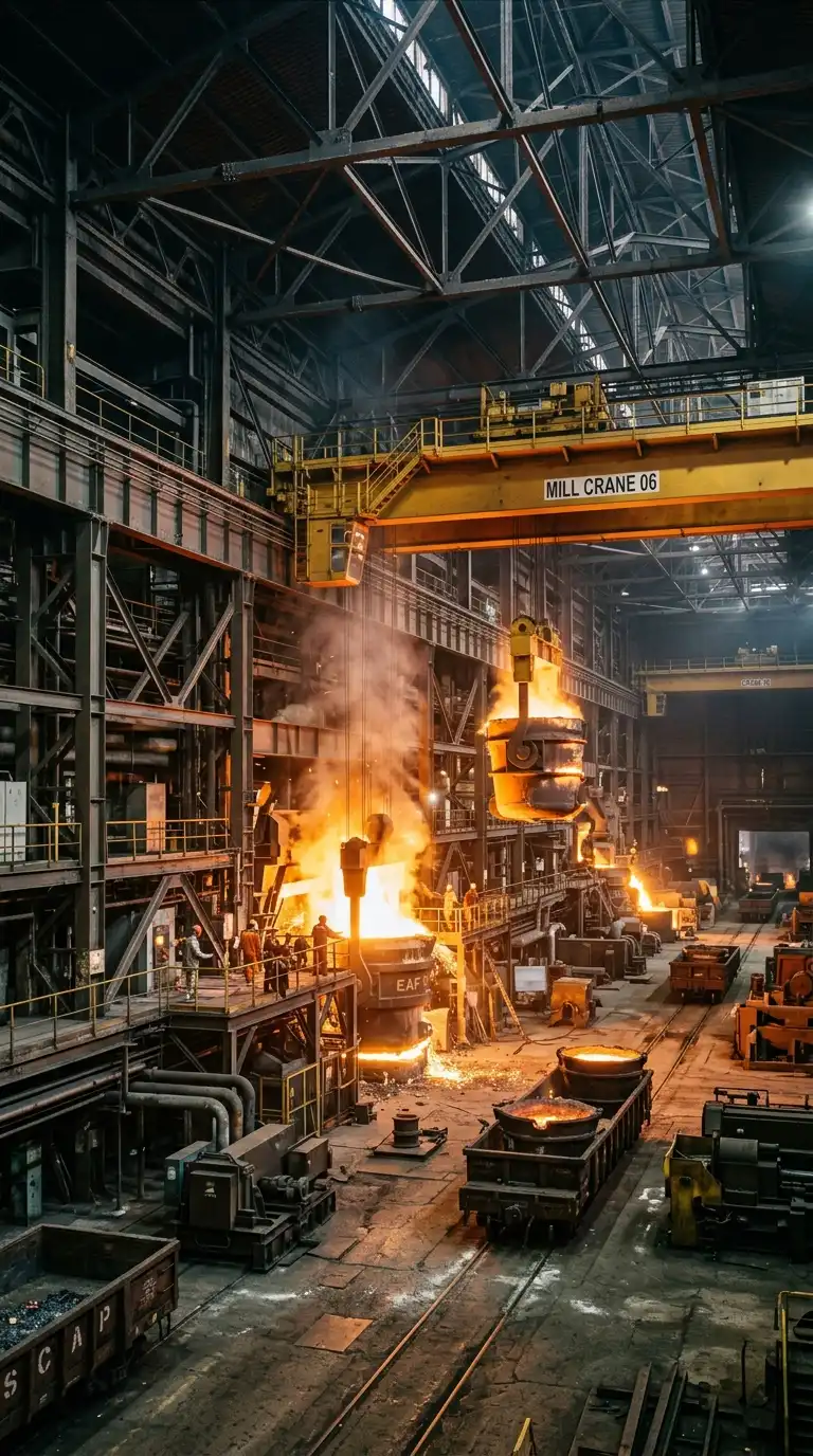 The steel mill is a complex of buildings for making steel. The buildings are huge, open, and dark. The structures are heavy steel. The spaces are filled with cranes, furnaces, and rolling mills. The steel mill is heroic, heavy, and dangerous.