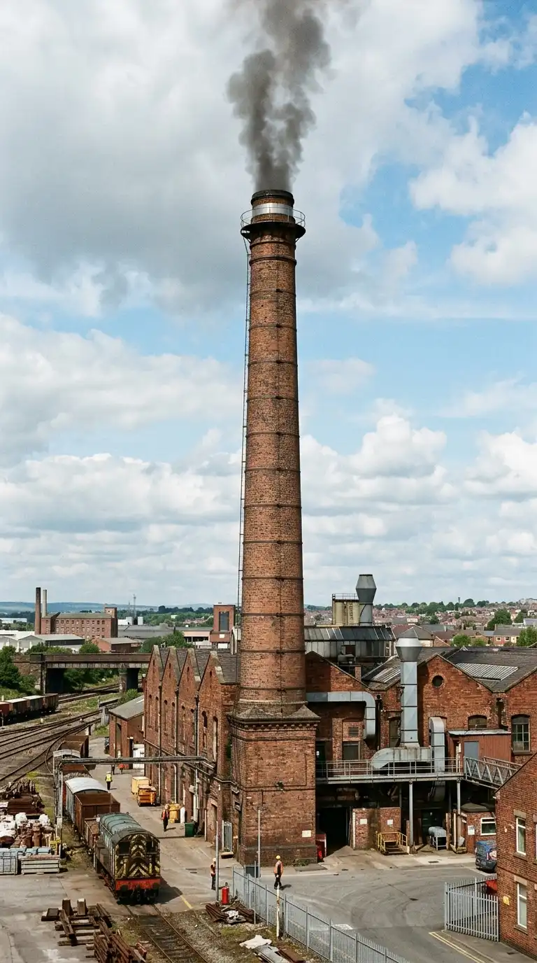 The factory chimney is a tall brick or concrete stack. The chimney releases smoke and gases. The chimney is a landmark. The factory chimney is vertical, industrial, and iconic.