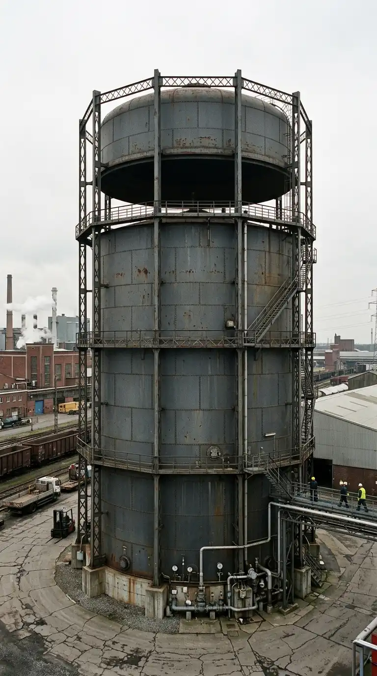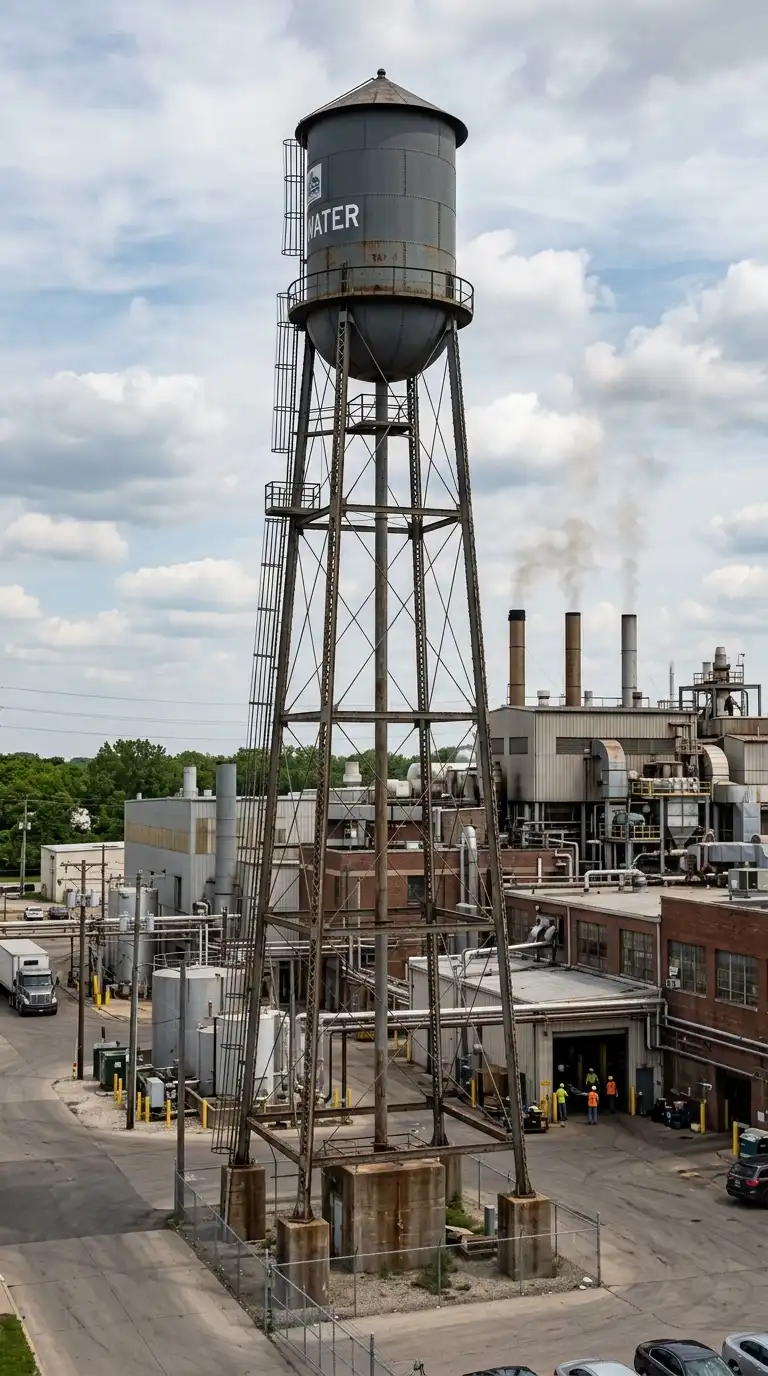 The water tower is a tall structure with a tank on top. The tower provides water pressure for the factory. The tank is often steel. The tower is steel or concrete. The water tower is vertical, structural, and utilitarian.