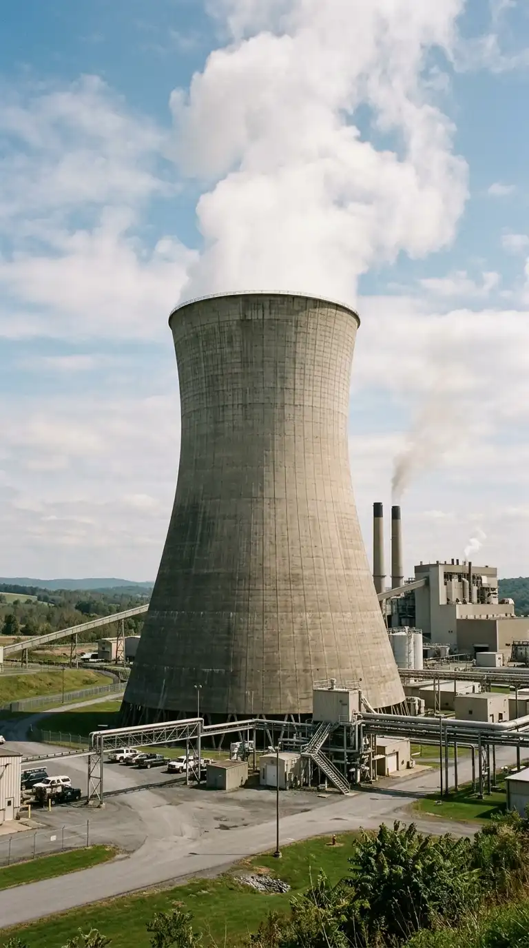 The cooling tower is a hyperbolic concrete tower for cooling water. The shape is a hyperboloid — curved inward at the waist. The cooling tower is curved, concrete, and cooling.