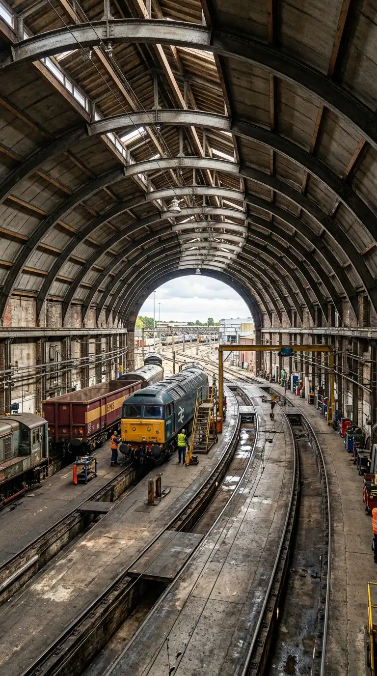 The railway shed is a large building for servicing trains. The shed has a curved roof (barrel vault) or a sawtooth roof. The shed is open at both ends for trains to pass through. The railway shed is curved, open, and railway.