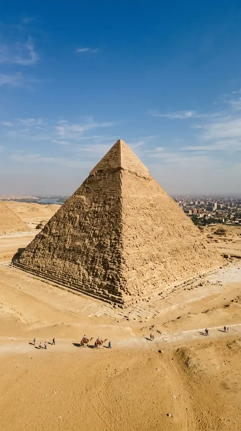 The pyramid is a square-based, four-sided stone tomb. The sides are smooth and sloping. The pyramid is aligned with the cardinal directions. The pyramid is the tomb of a pharaoh. The pyramid is massive, geometric, and eternal.