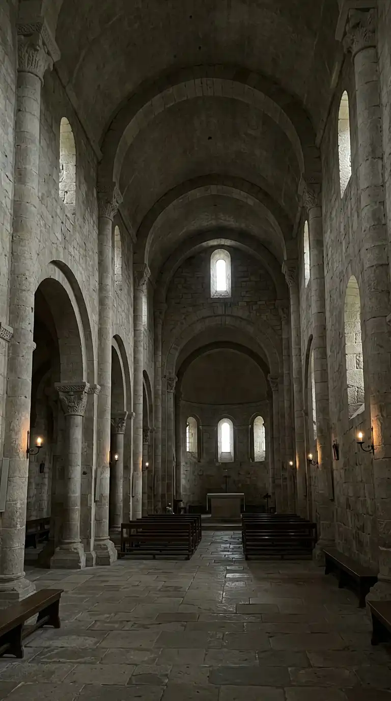 The Romanesque church has thick stone walls, small windows, and round arches. The interior is dark and heavy. The vault is a stone barrel vault. The Romanesque church is fortress-like, solid, and dark.