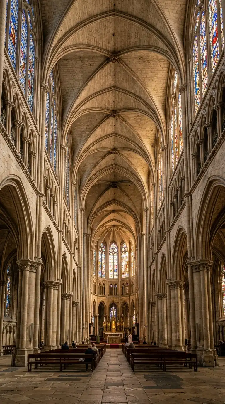 The Gothic cathedral has pointed arches, ribbed vaults, and flying buttresses. The walls are thin and filled with stained glass. The cathedral is tall, light, and vertical. The Gothic cathedral is aspiring, luminous, and awe-inspiring.