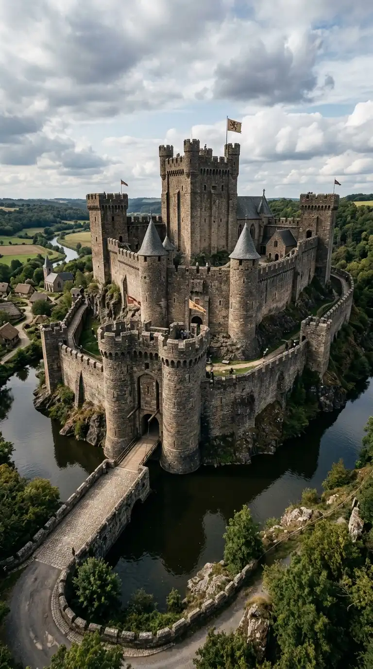 The medieval castle has high stone walls, corner towers, a gatehouse, and a moat. The walls are crenellated for defence. The castle is a fortress and a residence. The medieval castle is defensive, vertical, and powerful.