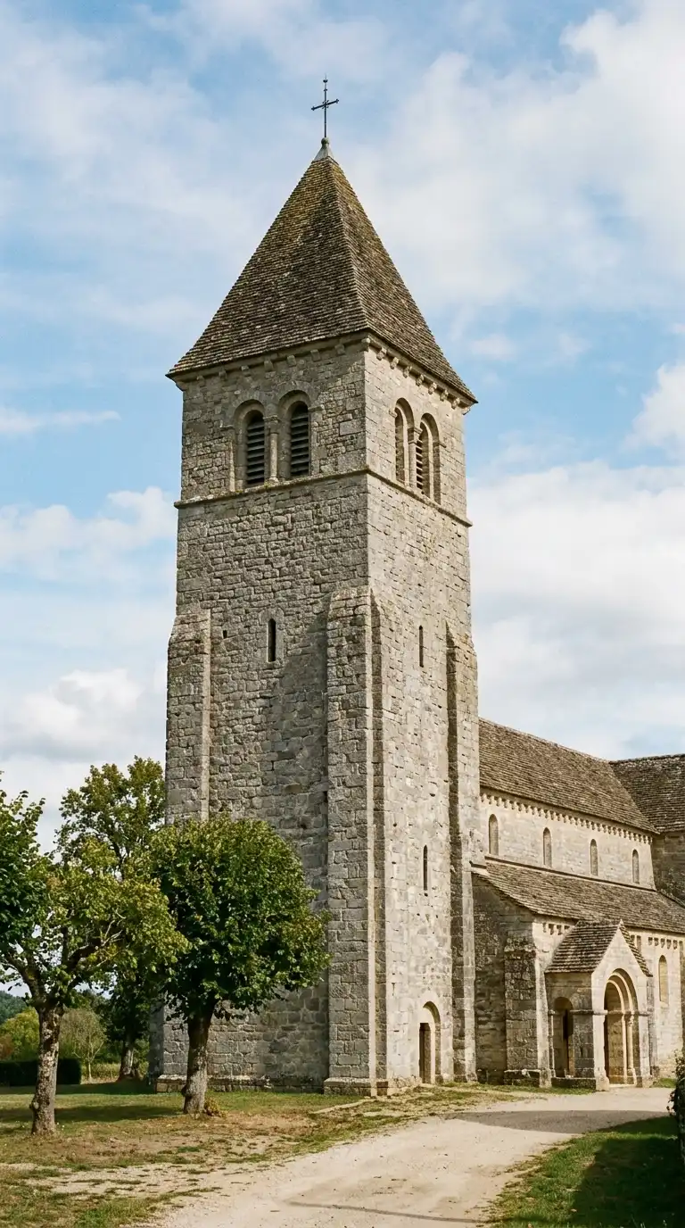 The Romanesque tower is a square stone tower with small windows and a pyramidal roof. The tower is solid, vertical, and defensive. The Romanesque tower is often part of a church or castle.
