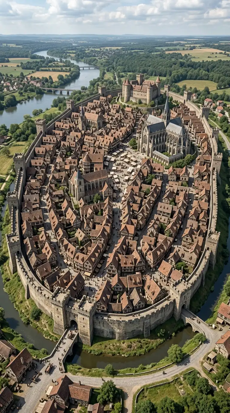 The medieval walled city is a city surrounded by a stone wall with gates and towers. The streets are narrow and winding. The buildings are timber-framed. The walled city is defensive, dense, and medieval.