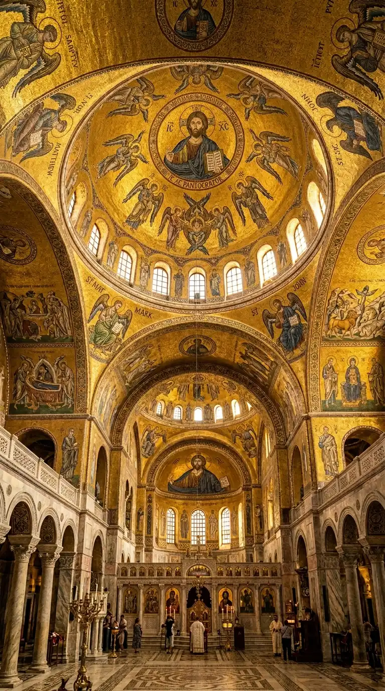 The Byzantine church is a centralised plan with a large dome on pendentives. The dome is the vault of heaven. The interior is covered in mosaics. The Byzantine church is celestial, golden, and mysterious.